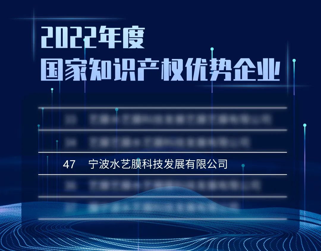 近日,國家知識產權局公布了2022年度國家知識產權優勢企業和示范企業評定結果,水藝膜科技憑借過硬的研發創新和知識產權管理優勢,榮膺“國家知識產權優勢企業”稱號。