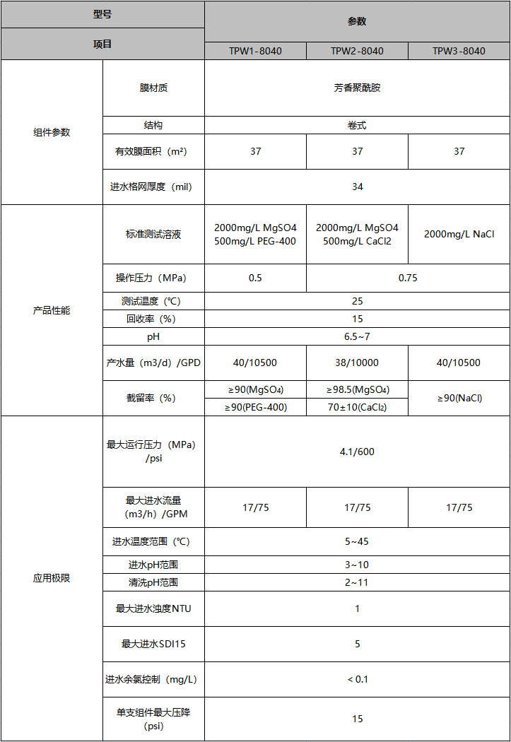 TPW1系列:TPW1主要針對(duì)水中有機(jī)物的脫除,保留大部分一價(jià)離子,適用于低鹽濃度水源。