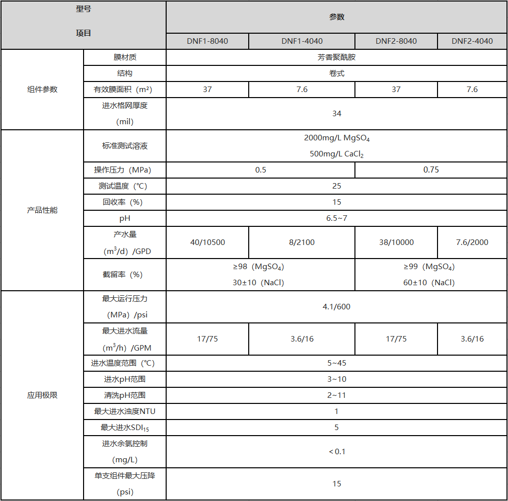 DNF1系列:對總有機碳(TOC)的脫除率高,對無機鹽的截留率中等,嵌入超低壓和耐污染膜制備技術(shù),實現(xiàn)污廢水深度處理領(lǐng)域運行能耗和使用壽命的雙重提升。